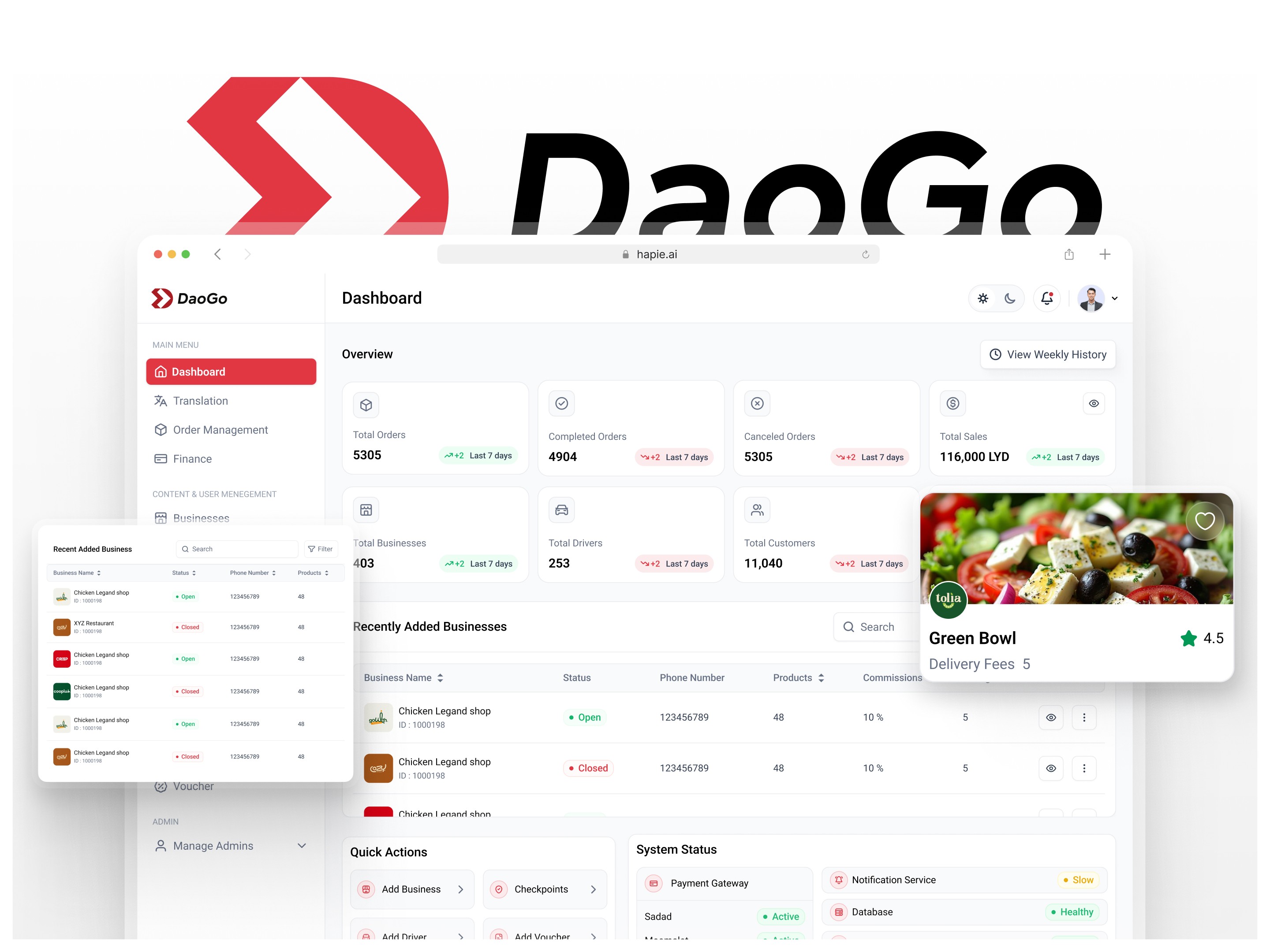 Daogo is an all-in-one super app and SaaS platform that brings together essential daily services food delivery, shopping, pharmacy, pet supplies, and more into a single, seamless experience. My role was to design both the customer-facing mobile application and the end-to-end admin dashboard that powers the platform.